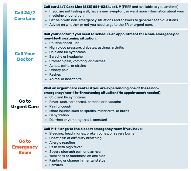 In the event that you do not feel well, you have options to get help. Knowing who to call and where to go is extremely important and can save you money.